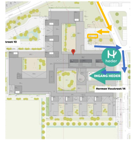 Het onthaal bevind zich aan de hoofdingang. Daarvoor stapt u via de stoep nog een klein stukje verder. (volg hiervoor de blauwe pijlen)